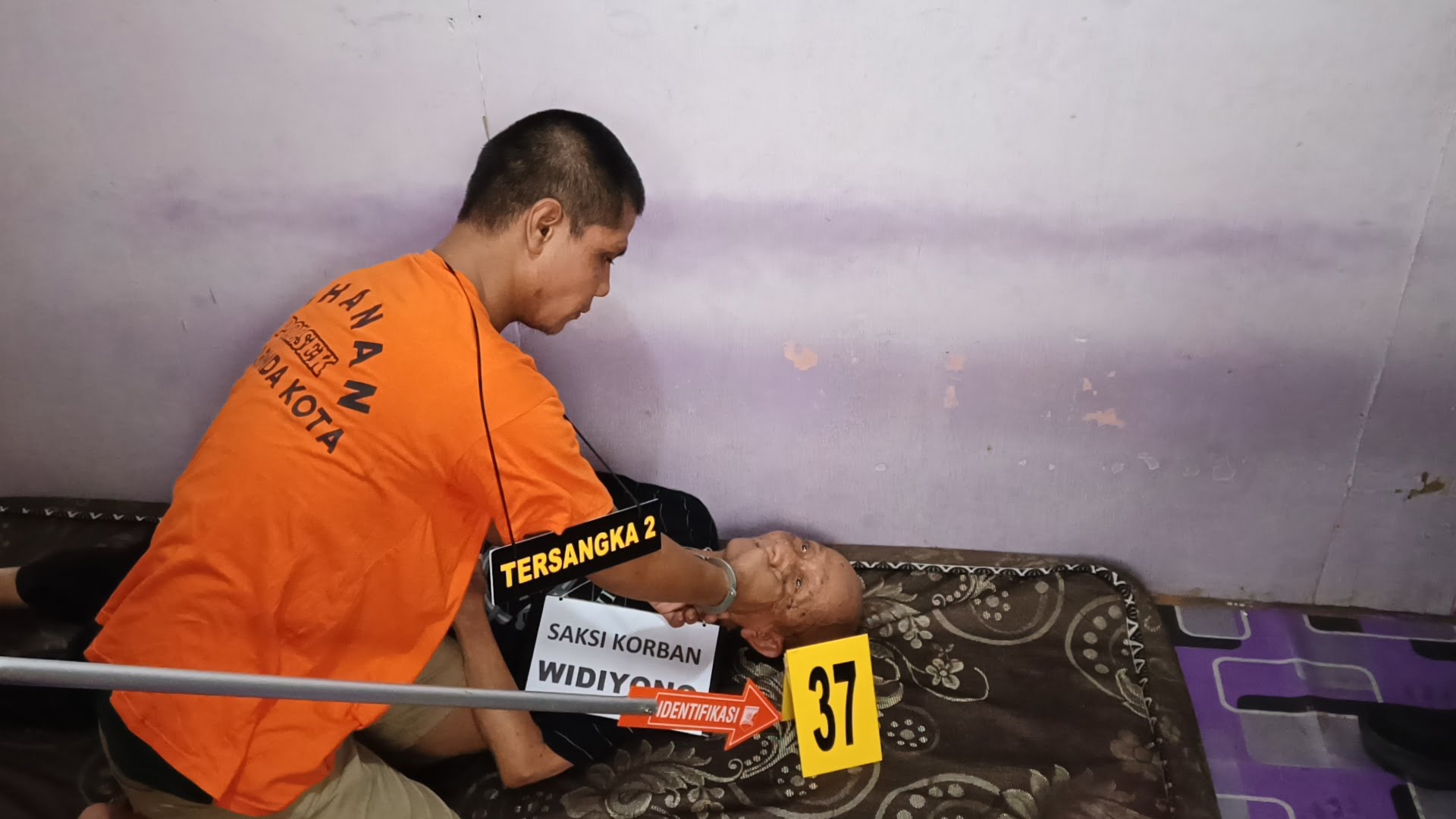 Adegan rekontruksi diperankan langsung oleh Solihin dan Nando. Sementara untuk korban juga diperankan langsung oleh Wiyono (83) yang tak lain adalah mertua dari Solihin.